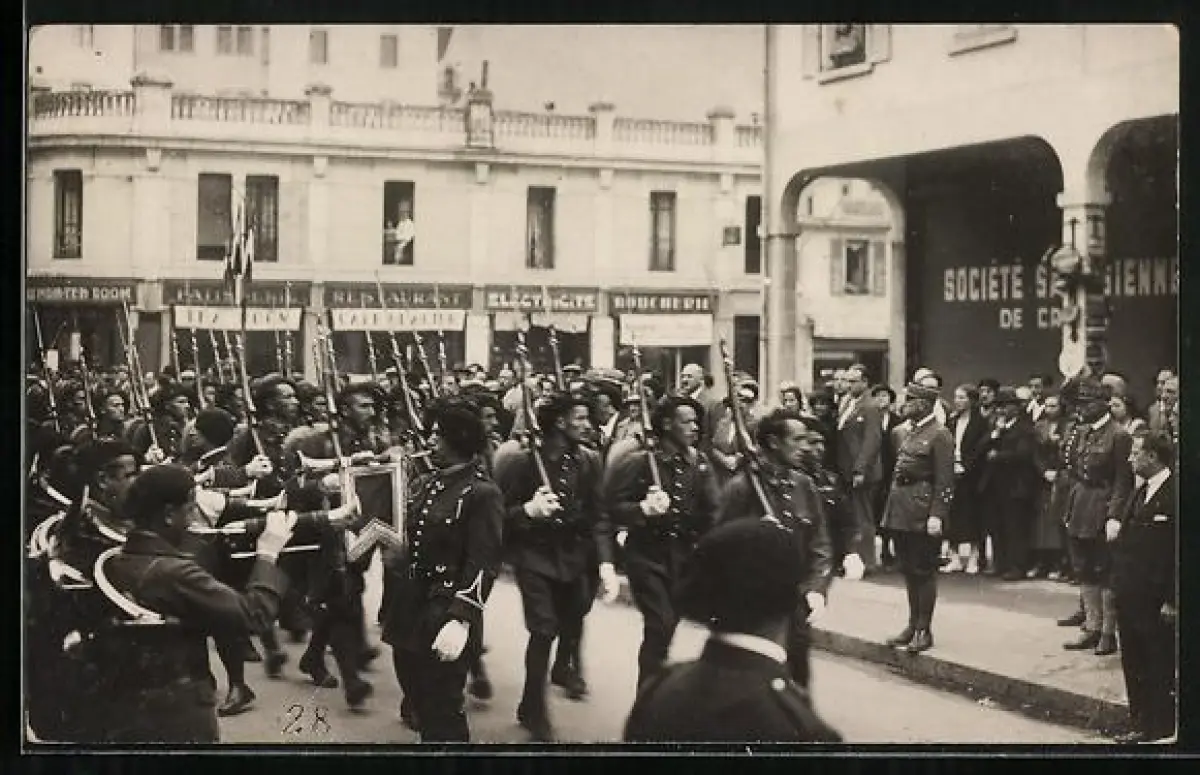 AK Chamonix, Französische Alpenjäger auf Marsch durch Chamonix