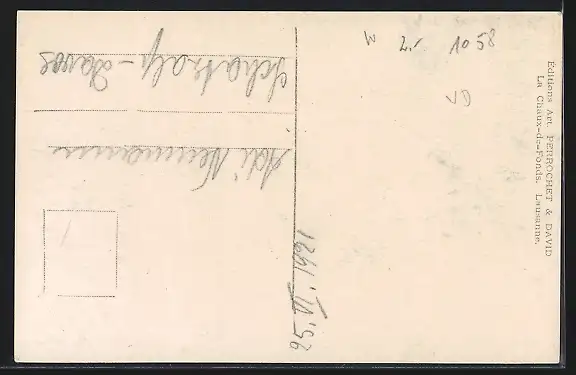 Personenbezogene Daten auf der Rückseite der Karte wurden durch blauen Textmarker unkenntlich gemacht. Die blauen Stellen sind auf die Vorderseite durchgeweicht und wirken sich negativ auf das Postkartenfoto aus