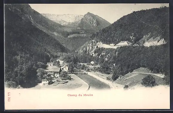 AK Champ du Moulin, Totalansicht mit Brücke, um 1900