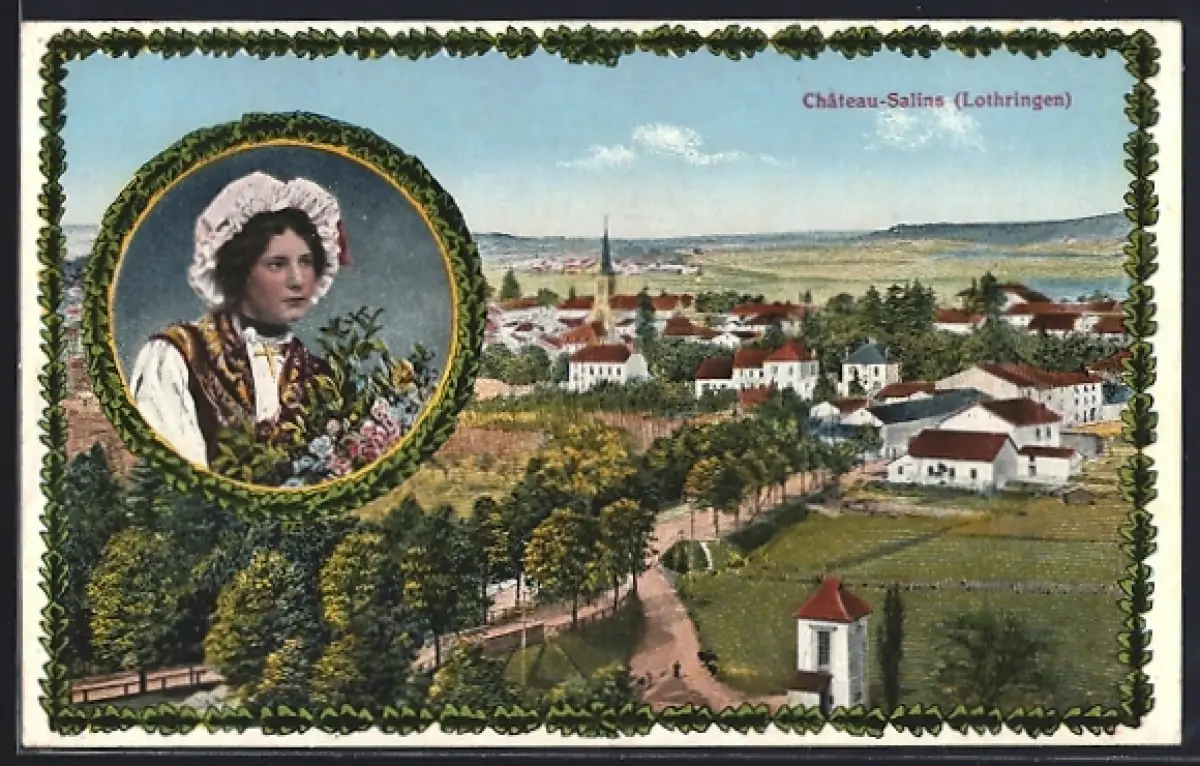 AK Château-Salins /Lothringen, Teilansicht mit Strassenpartie, Frau in Tracht