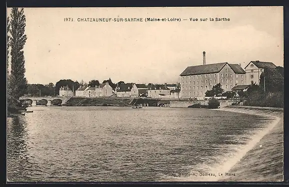 AK Châteauneuf-sur-Sarthe, Vue sur la Sarthe et le pont en arrière-plan