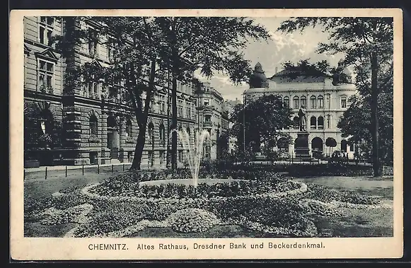 AK Chemnitz, Altes Rathaus, Dresdner Bank und Springbrunnen