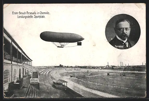 AK Chemnitz, Erster Besuch Parseval`s in der Stadt, Landungsstelle: Sportplatz mit Luftschiff