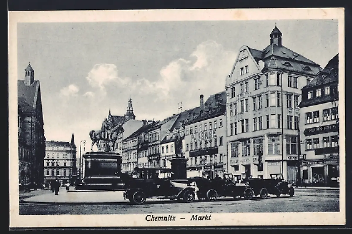 AK Chemnitz, Markt mit Geschäften und Denkmal