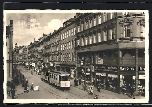 AK Chemnitz, Strassenbahn in der Poststrasse, Geschäfte