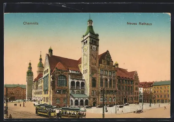 AK Chemnitz, Strassenbahn vor dem Neuen Rathaus