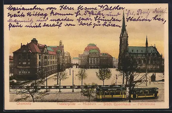 AK Chemnitz, Theaterplatz, Museum, Städtisches Opernhaus, Petrikirche und Strassenbahn