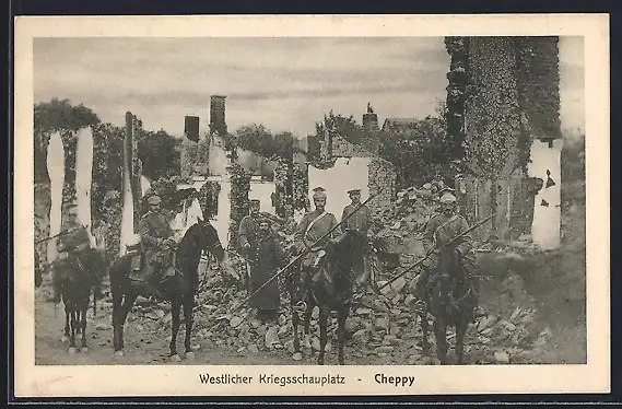 AK Cheppy, Ulanen vor zerstörten Häusern