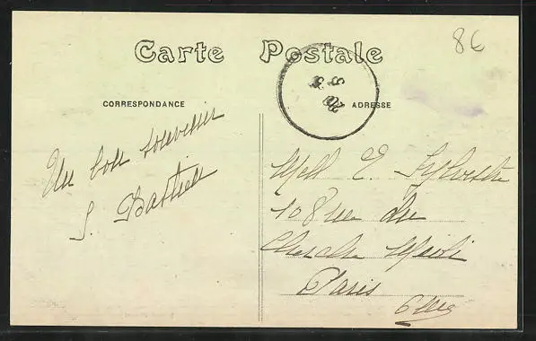 Personenbezogene Daten auf der Rückseite der Karte wurden durch blauen Textmarker unkenntlich gemacht. Die blauen Stellen sind auf die Vorderseite durchgeweicht und wirken sich negativ auf das Postkartenfoto aus