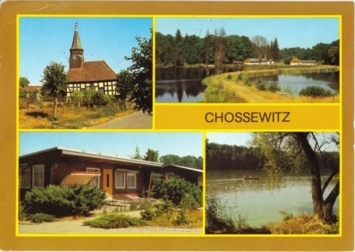 Ansichtskarte Chossewitz Kr. Beeskow 4 Abb., Alte Fachwerk-Dorfkirche, Blick über den Klingeteich, In der Bungalowsiedlung, Chossewitzer See Erhaltung I-II postalisch gelaufen, gestempelt: Beeskow, 14.3.88 Druckvermerk: ohne, um 1988 Herstellungsland: DDR Verlag: Bild und Heimat Reichenbach - 01 05 0339/02