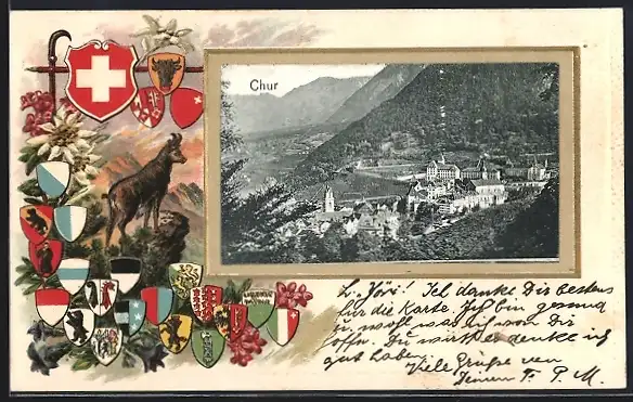 AK Chur, Totalansicht vom Berg aus, Passepartout mit Kantonalwappen und Gämse