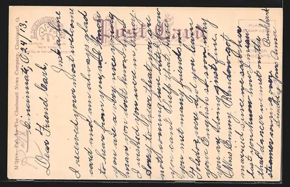 Personenbezogene Daten auf der Rückseite der Karte wurden durch blauen Textmarker unkenntlich gemacht. Die blauen Stellen sind auf die Vorderseite durchgeweicht und wirken sich negativ auf das Postkartenfoto aus