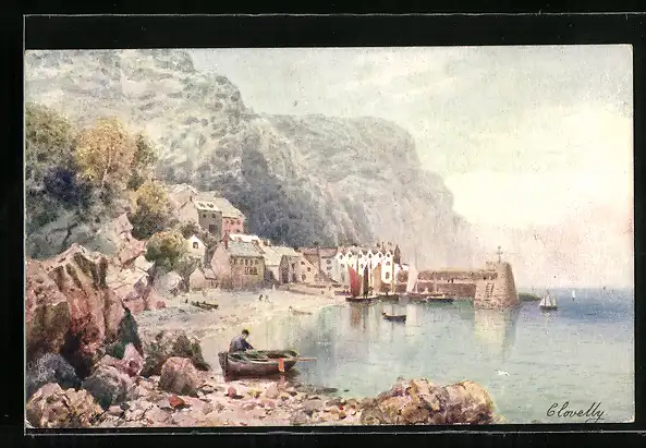 AK Clovelly, Teilansicht mit Pier, Uferpartie und Felsen, Ruderboot