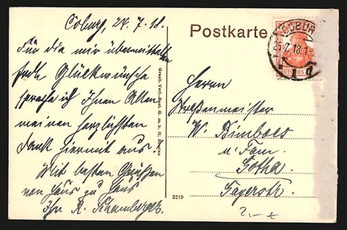 gelaufen 1918, rückseitig Klebe- und Papierreste, guter Zustand