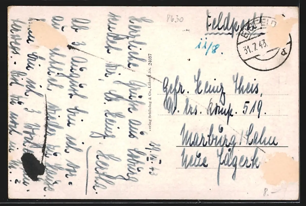 alte Ansichtskarte, gelaufen 1943 als Feldpost, rückseitig Klebe- und Papierreste, rückseitig Oberflächenschaden, Eckknick links unten