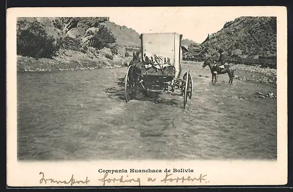 AK Compania Huanchaca de Bolivia, Esel-Fuhrwerk im Fluss
