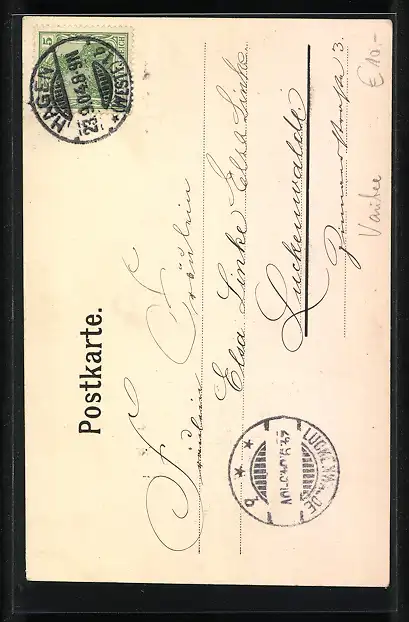 alte Ansichtskarte, gelaufen 1904, Eckknick unten re., Stempelspur, guter Zustand