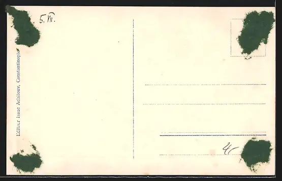 Personenbezogene Daten auf der Rückseite der Karte wurden durch blauen Textmarker unkenntlich gemacht. Die blauen Stellen sind auf die Vorderseite durchgeweicht und wirken sich negativ auf das Postkartenfoto aus