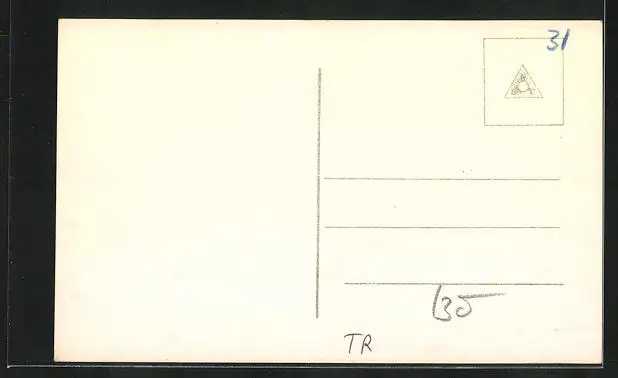 Personenbezogene Daten auf der Rückseite der Karte wurden durch blauen Textmarker unkenntlich gemacht. Die blauen Stellen sind auf die Vorderseite durchgeweicht und wirken sich negativ auf das Postkartenfoto aus