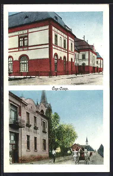 AK Cop-Csap, Strassenpartie mit Bank und Ochsenwagen