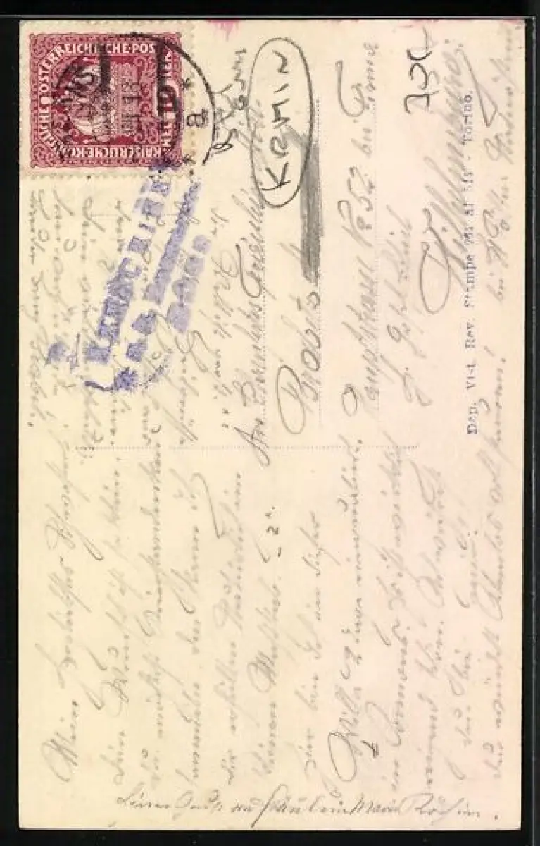 Personenbezogene Daten auf der Rückseite der Karte wurden durch blauen Textmarker unkenntlich gemacht. Die blauen Stellen sind auf die Vorderseite durchgeweicht und wirken sich negativ auf das Postkartenfoto aus