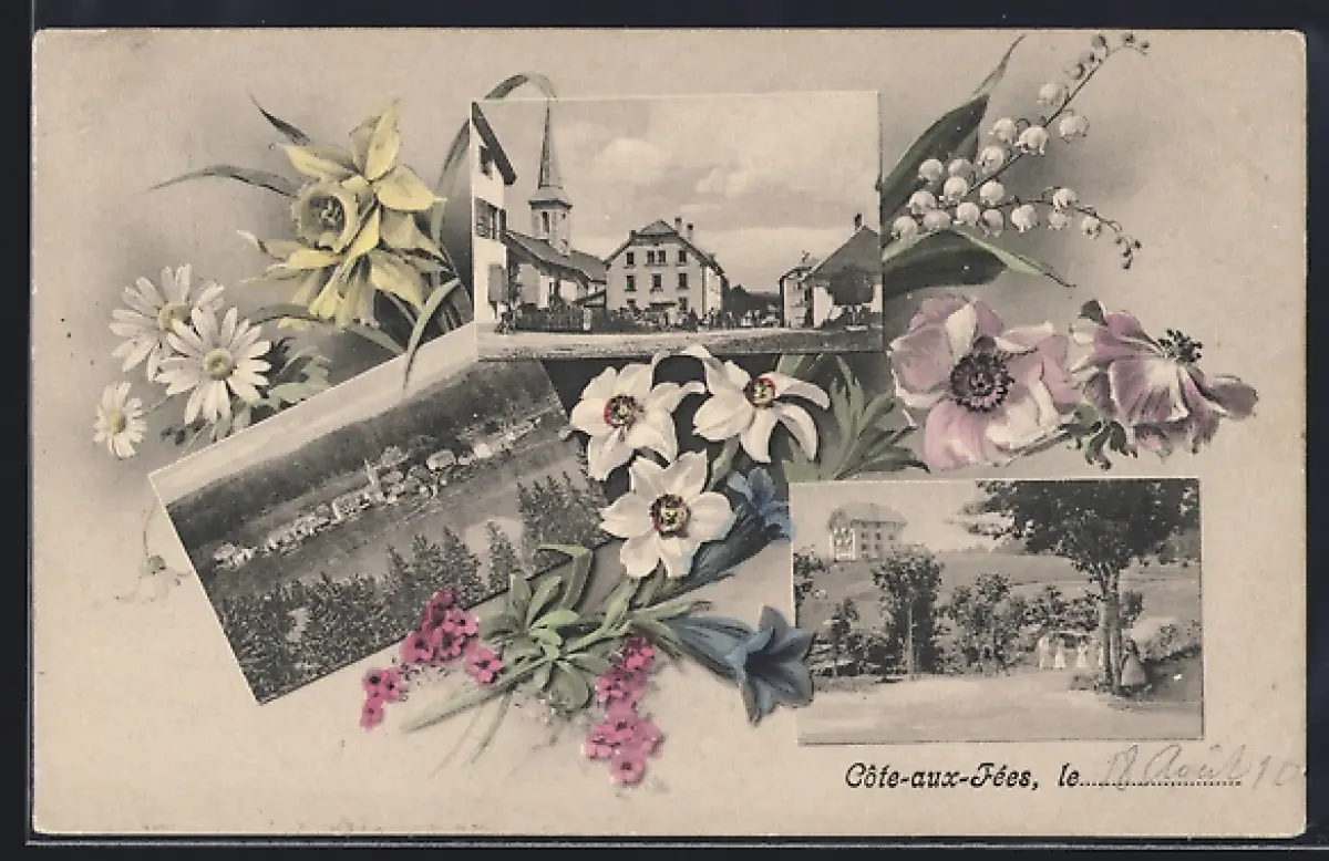 AK Côte-aux-Fées, Strassenpartie, Uferpartie, Ortspartie, Margeriten u. Glockenblume