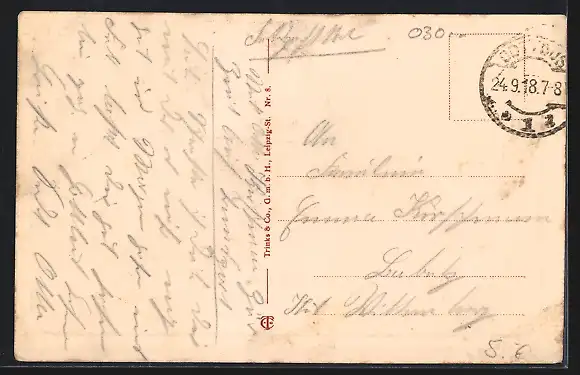 alte Ansichtskarte, gelaufen 1918, Bugspur oben, Eckknick unten li., guter Zustand