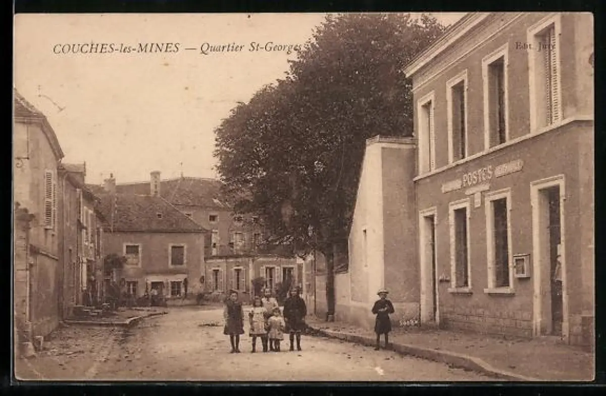 AK Couches-les-Mines, Quartier St-Georges avec bureau de poste et enfants dans la rue