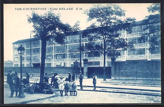 AK Courbevoie, Usine Delage E.M. avec passants devant l`entrée
