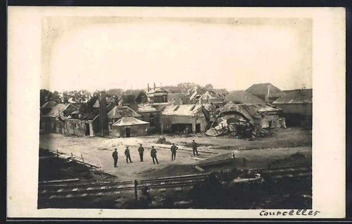 AK Courcelles, Ruines après bombardement avec soldats en avant-plan