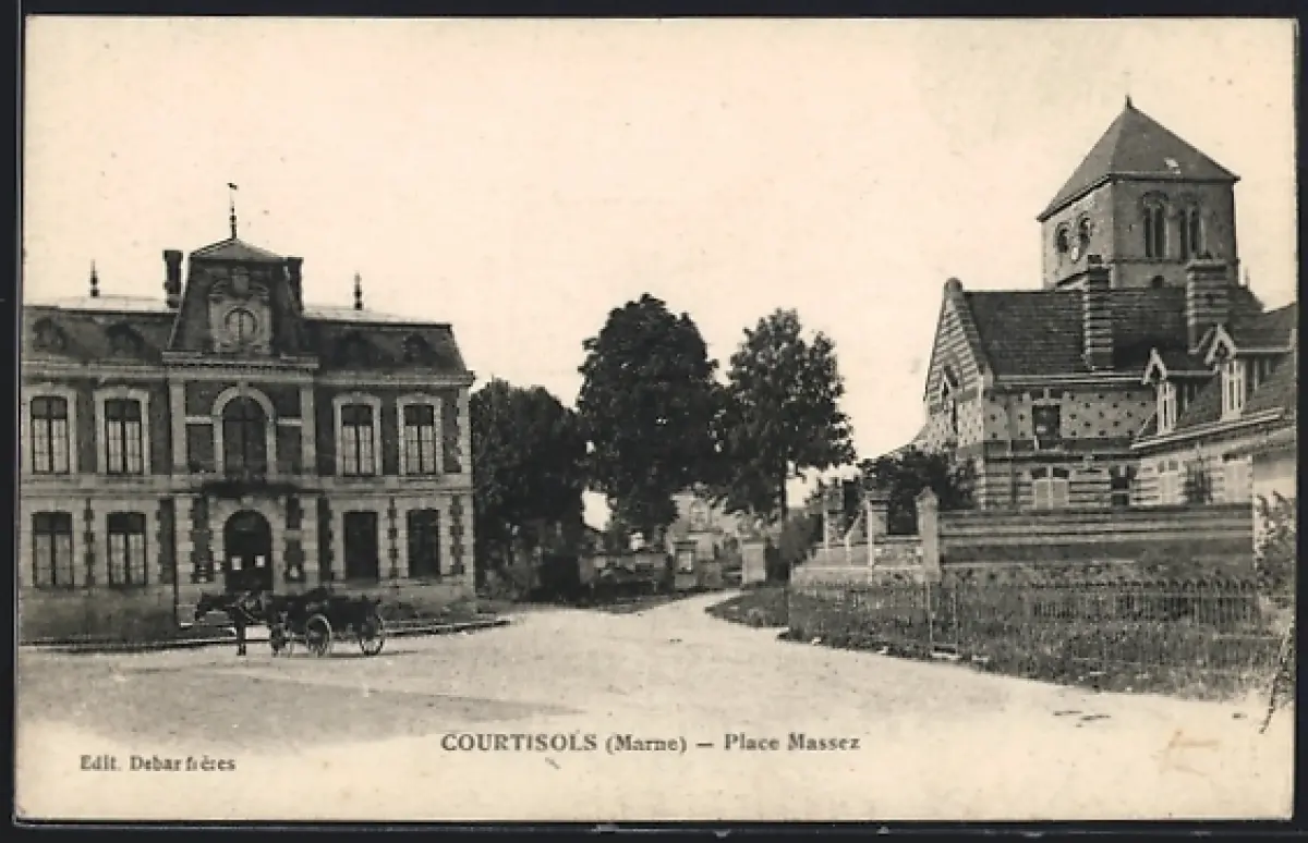 AK Courtisols /Marne, Place Massez avec bâtiments historiques et charrette