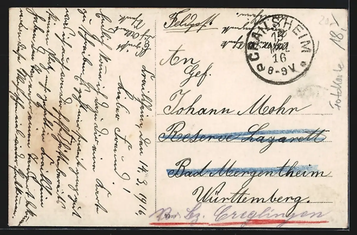 Personenbezogene Daten auf der Rückseite der Karte wurden durch blauen Textmarker unkenntlich gemacht. Die blauen Stellen sind auf die Vorderseite durchgeweicht und wirken sich negativ auf das Postkartenfoto aus