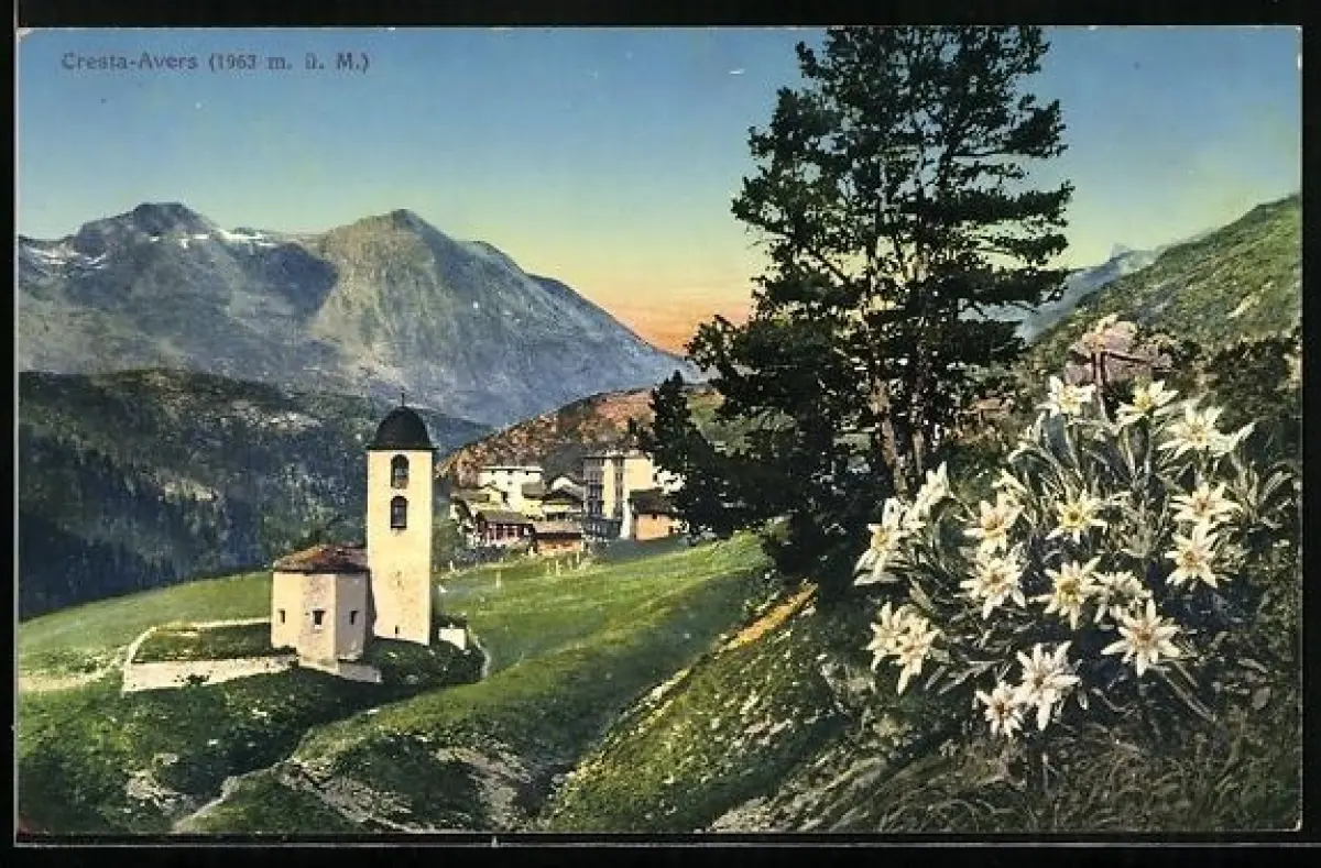 AK Cresta-Avers, Ortsansicht mit Kirche