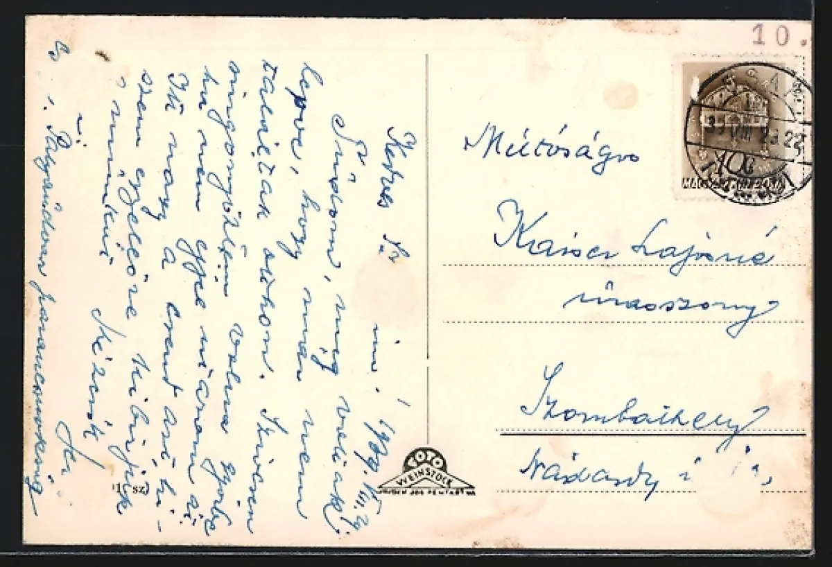 Personenbezogene Daten auf der Rückseite der Karte wurden durch blauen Textmarker unkenntlich gemacht. Die blauen Stellen sind auf die Vorderseite durchgeweicht und wirken sich negativ auf das Postkartenfoto aus
