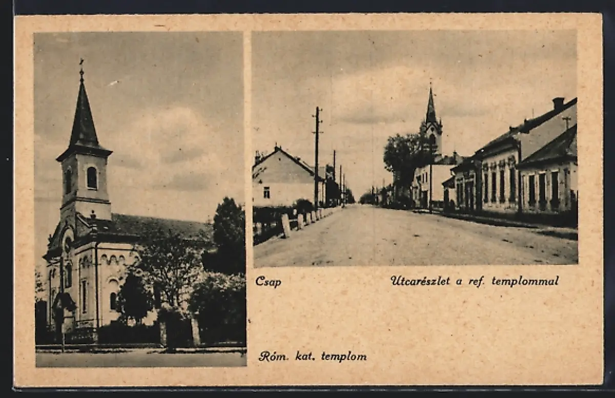 AK Csap, Róm. kat. templom, Utcarészlet a ref. templommal