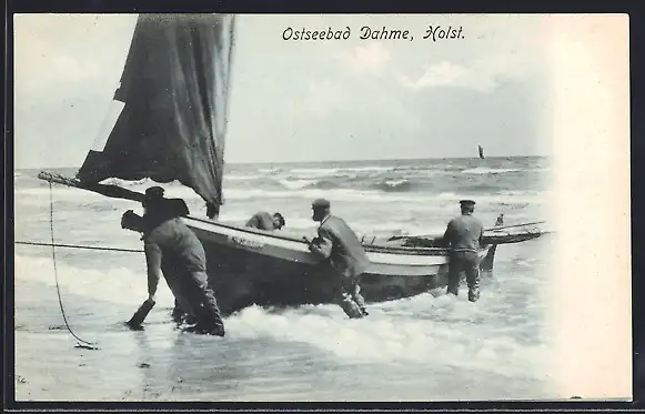 AK Dahme / Ostseebad, Fischerboot in der Dünung