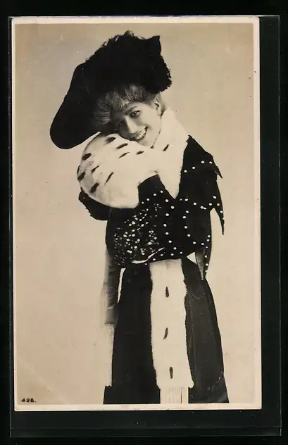 AK Dame in schwarzem Kleid mit weissem Pelz