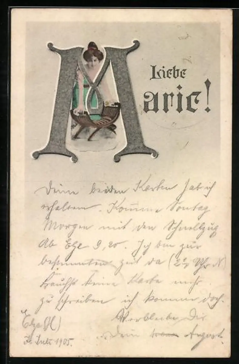 AK Dame lehnt sich auf einen Stuhl, Liebe Marie, Namenstag