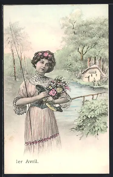AK Dame mit Angel und Fisch, 1. April