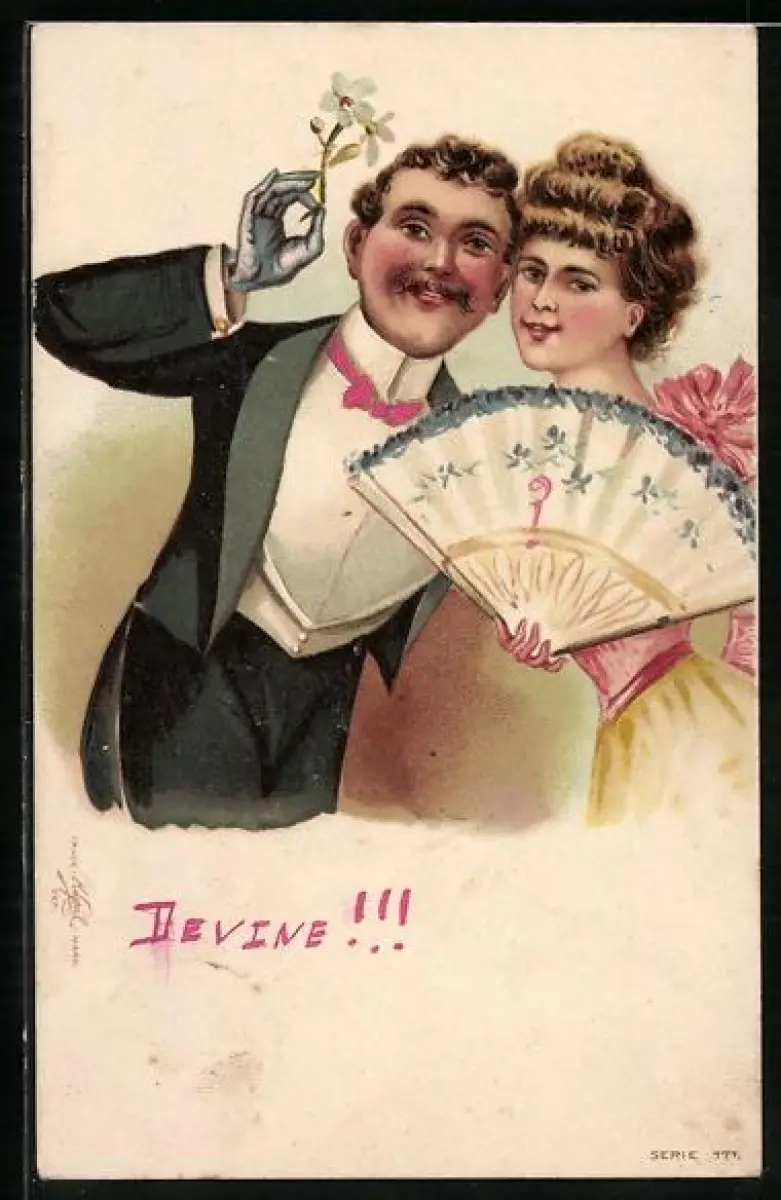 AK Dame mit Fächer u. Galan im Frack mit Blumen