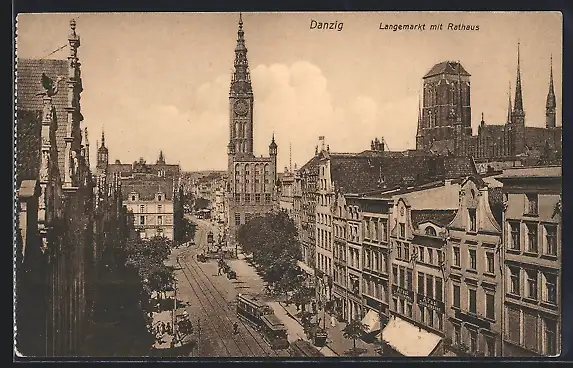 AK Danzig, Langemarkt mit Rathaus und Strassenbahn