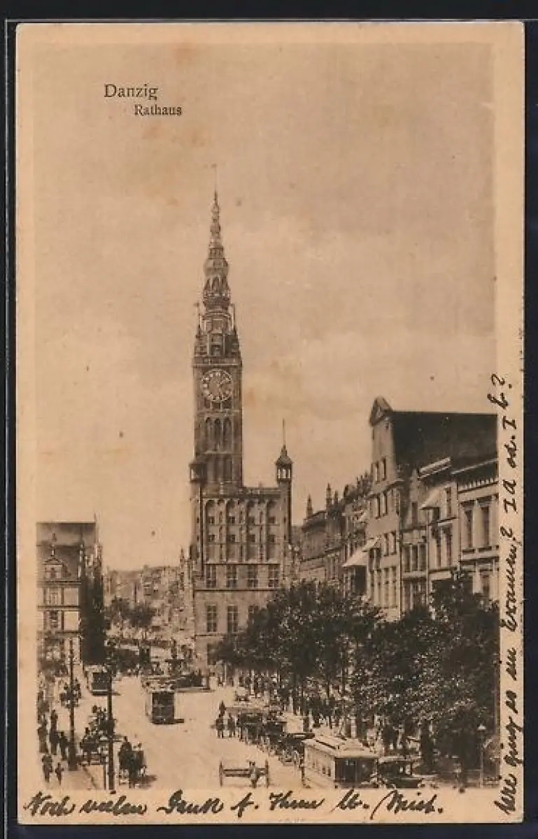AK Danzig, Rathaus mit Strassenbahn