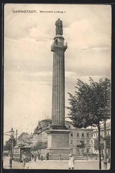 AK Darmstadt, Monument Ludwig I., Strassenbahn