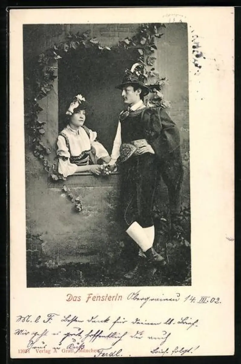 AK Das Fensterln, Herr steht bei einer Dame am Fenster
