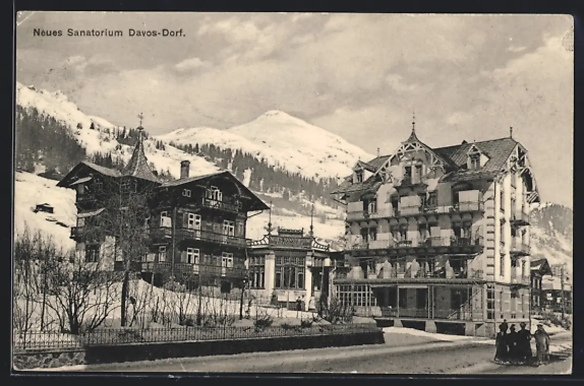AK Davos-Dorf, Neues Sanatorium mit Strassenpartie