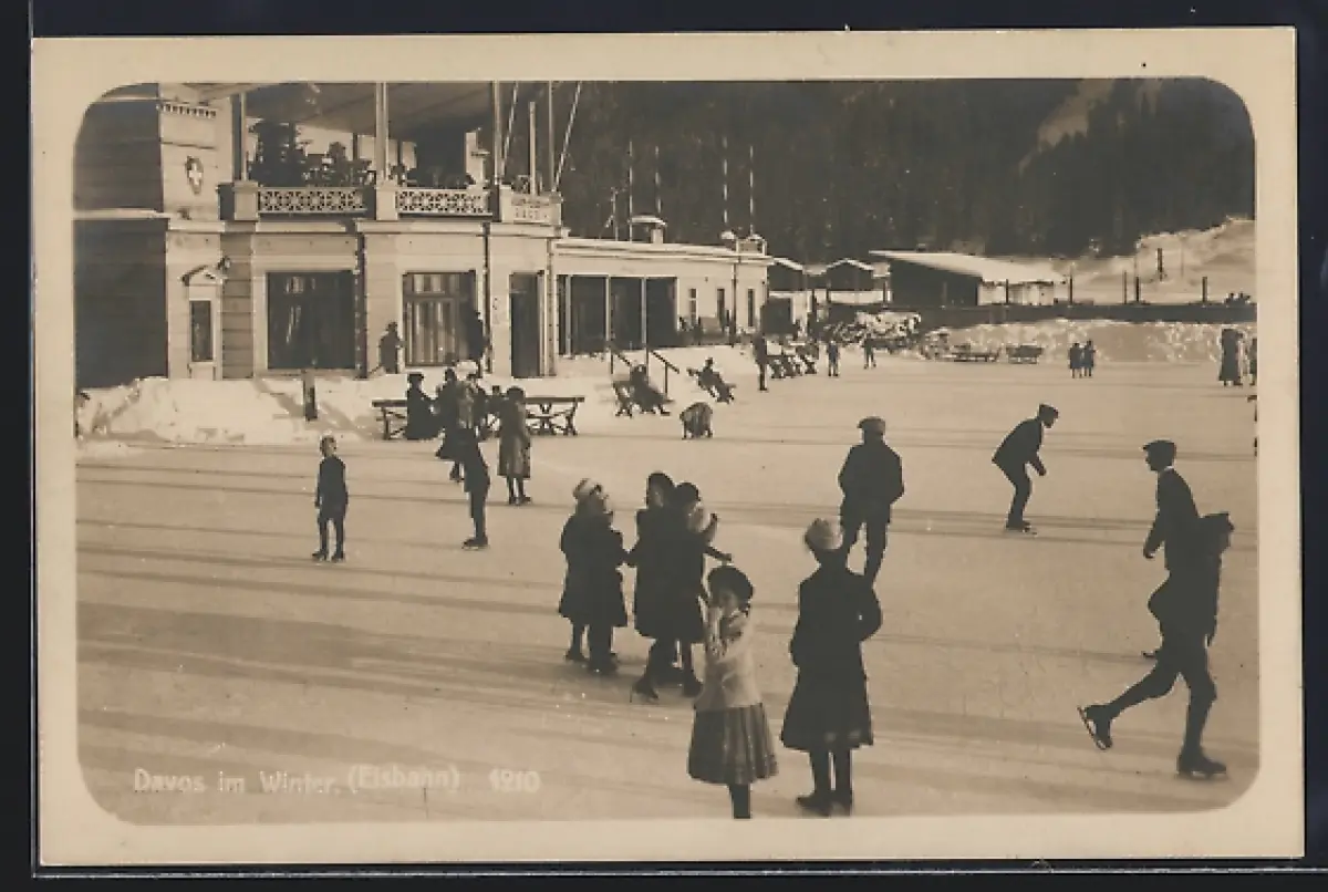 AK Davos, Eisbahn mit Schlittschuhläufern im Winter