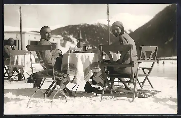 AK Davos, Erich Maria Remarque mit seiner Frau beim Kaffee am See