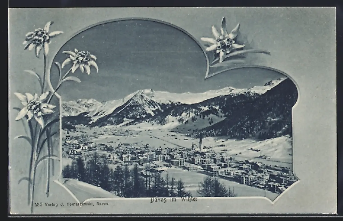 AK Davos, Teilansicht im Winter, Edelweiss, Passepartout