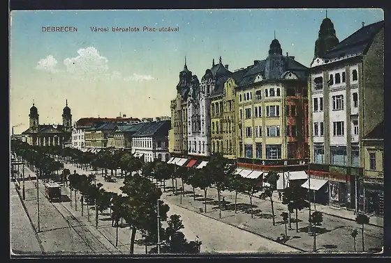 AK Debrecen, Városi bérpalota Piac-utcával, Strassenbahn