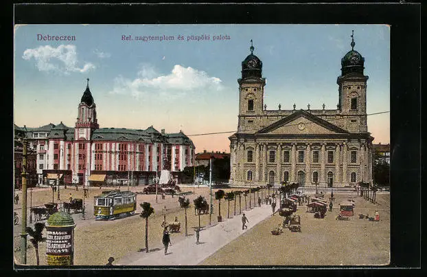 AK Debreczen, Ref. uagytemplom es püspöki palota, Strassenbahn